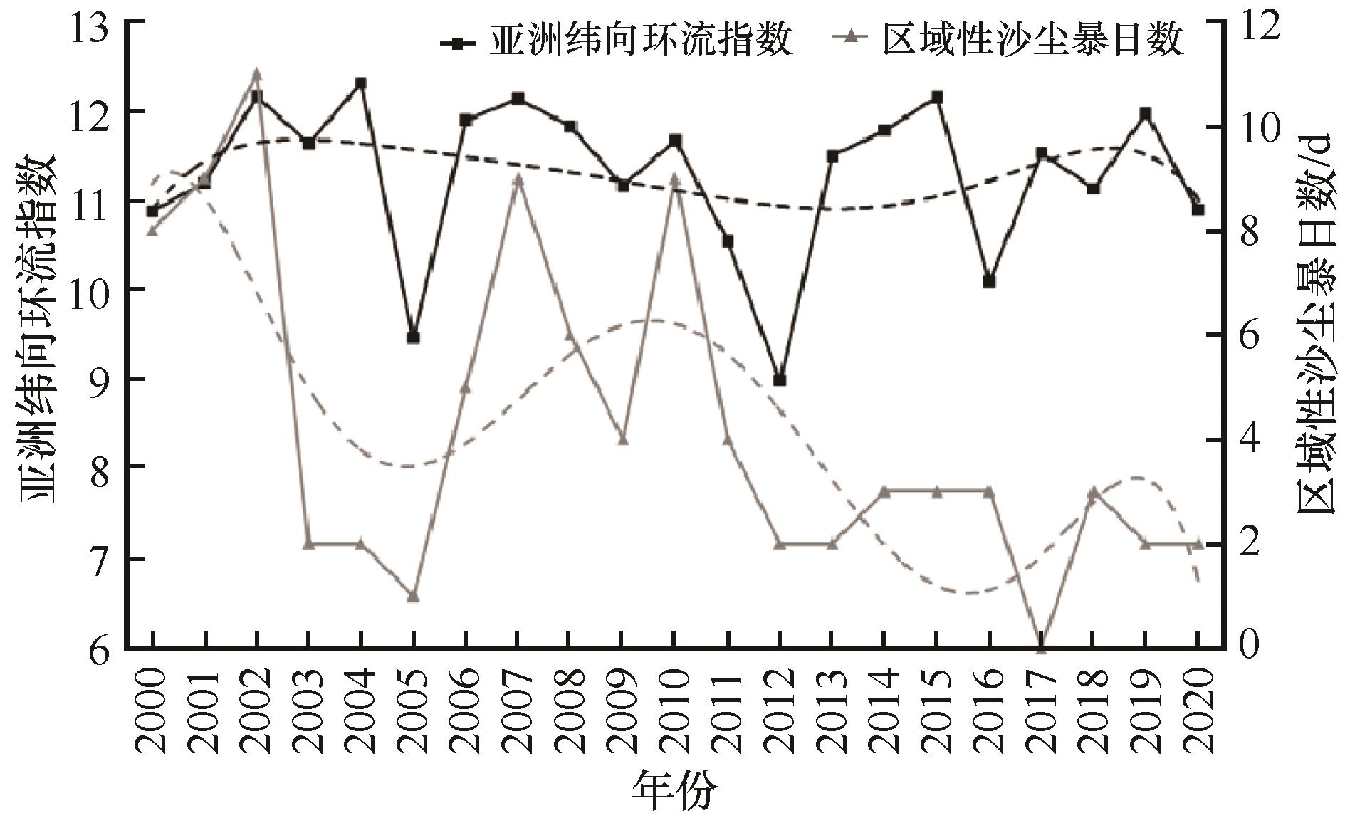 利用地面观测资料分析了2000—2020年中国西北地区区域性沙尘暴特征,同时基于气候动力因子、温度、降水和NDVI资料,研究西北地区区域性沙尘暴成因。结果表明:2000—2020年西北地区区域性沙尘暴年总日数呈波动下降趋势,且存在两个高(低)频期。春季是区域性沙尘暴高发季,其中4月总日数最高,达47 d;相较于上旬和中旬,春季各月下旬更易出现区域性沙尘暴。新疆南部的塔里木盆地、内蒙古中西部和甘肃河西是西北地区区域性沙尘暴高发区,总日数均在10 d以上,其余大部分地方总日数均小于8 d。北半球极涡面积指数、强度指数及亚洲区极涡强度指数均与区域性沙尘暴日数显著正相关,北半球极涡从扩张期到收缩期转变及其强度的减弱,是西北地区区域性沙尘暴减少的重要气候动力因素。西北地区年(春季)降水量和平均NDVI均与区域性沙尘暴日数显著负相关,近21年西北地区大部分地方气候趋于暖湿化,植被覆盖整体以改善为主要趋势,此种转变有利于沙化面积收缩,减少非输入性沙尘暴的发生。