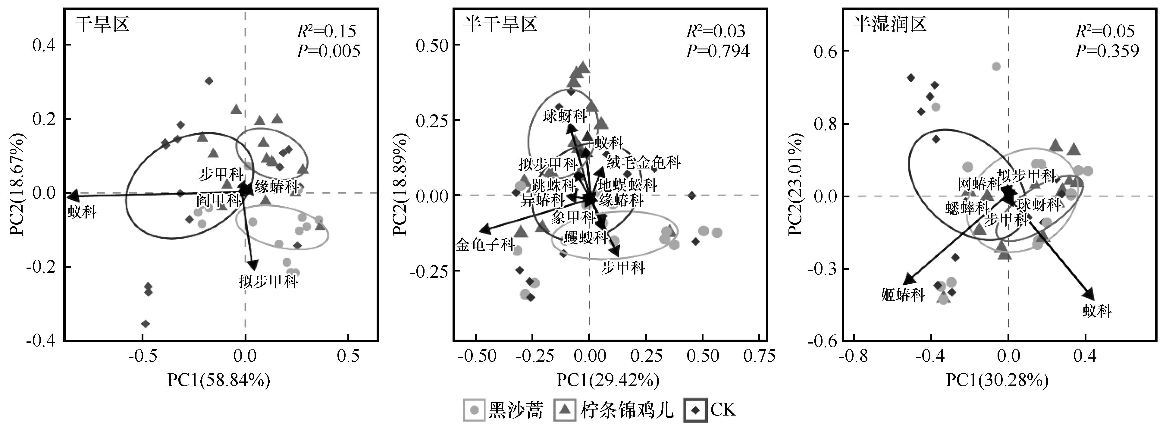 Fig.4 Redundancy analysis (dbRDA) of the effects of environmental factors on ground-dwelling arthropods communities