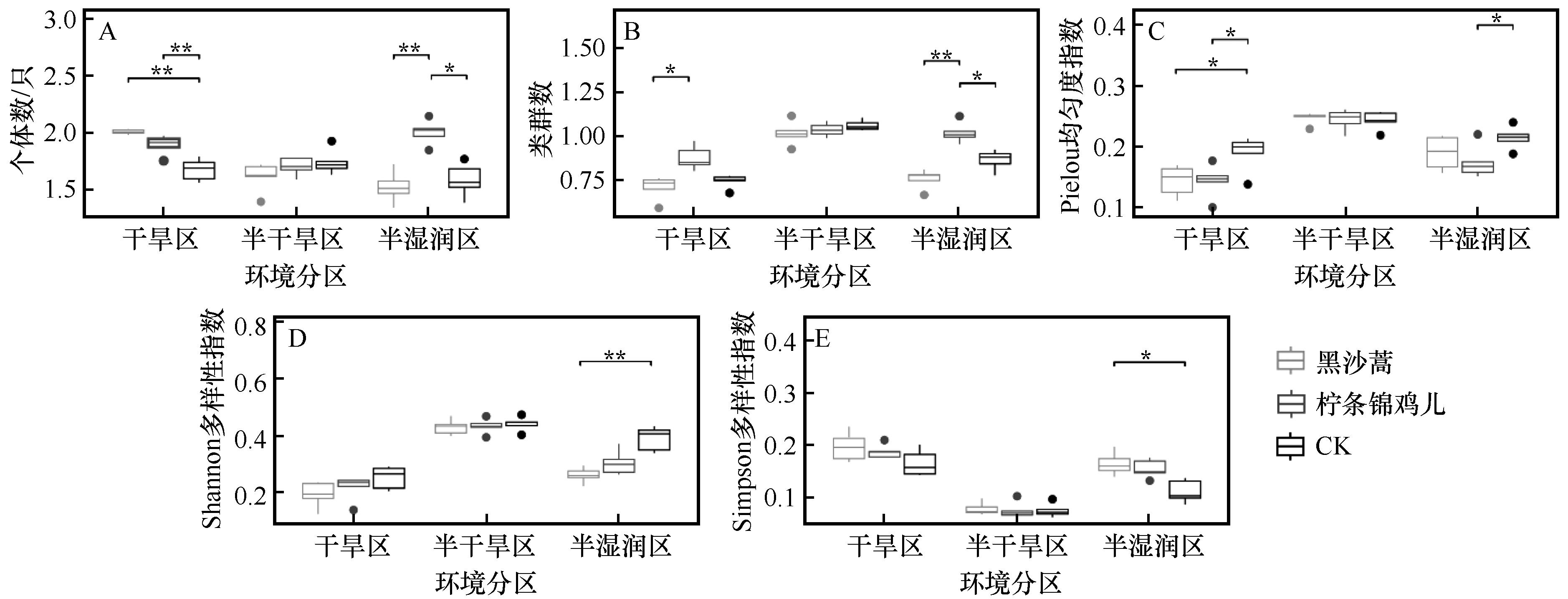 表6 不同降水梯度灌丛微生境间地面节肢动物群落结构的差异