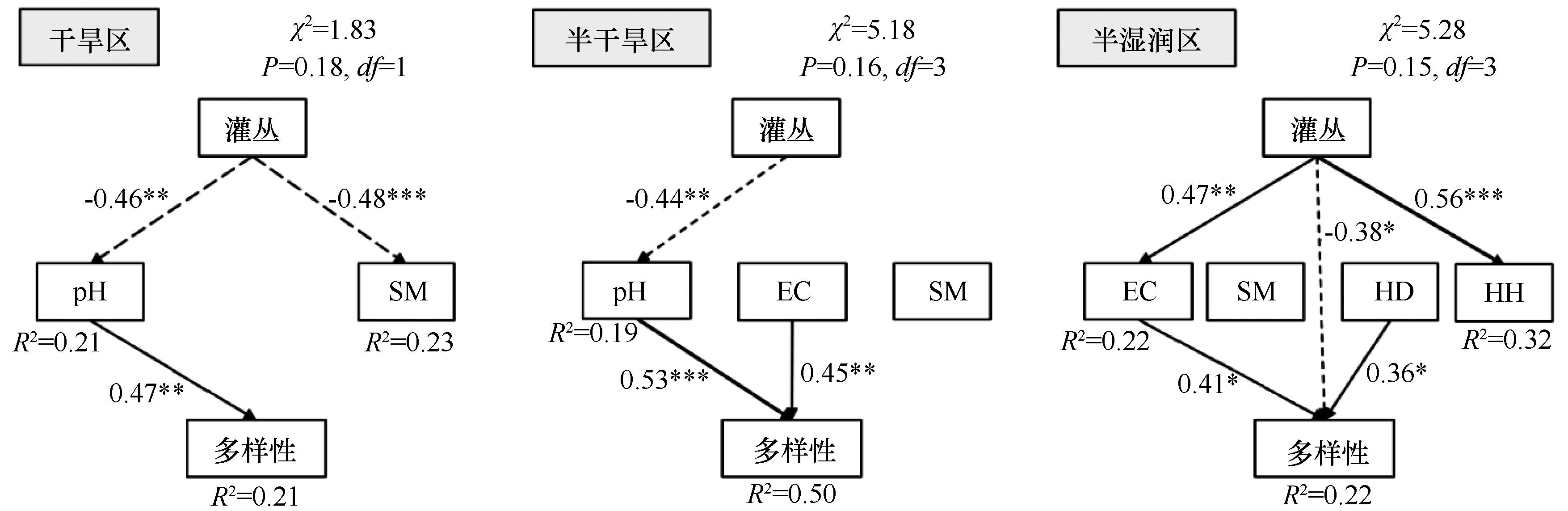 图5 不同降水梯度地面节肢动物多样性与环境因子的结构方程模型注:实线表示正向效应,虚线表示负向效应。*: P<0.05; **: P<0.01; ***: P<0.001。 pH: 土壤pH; SM: 土壤含水量; EC: 土壤电导率; HD: 草本植物密度; HH: 草本植物高度