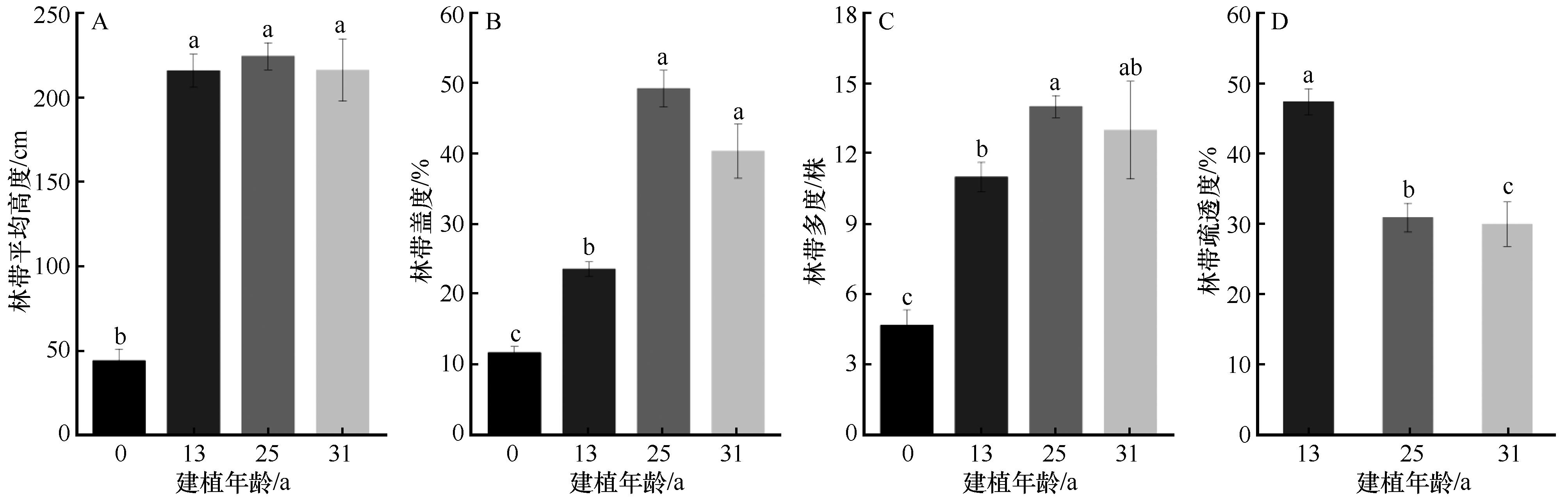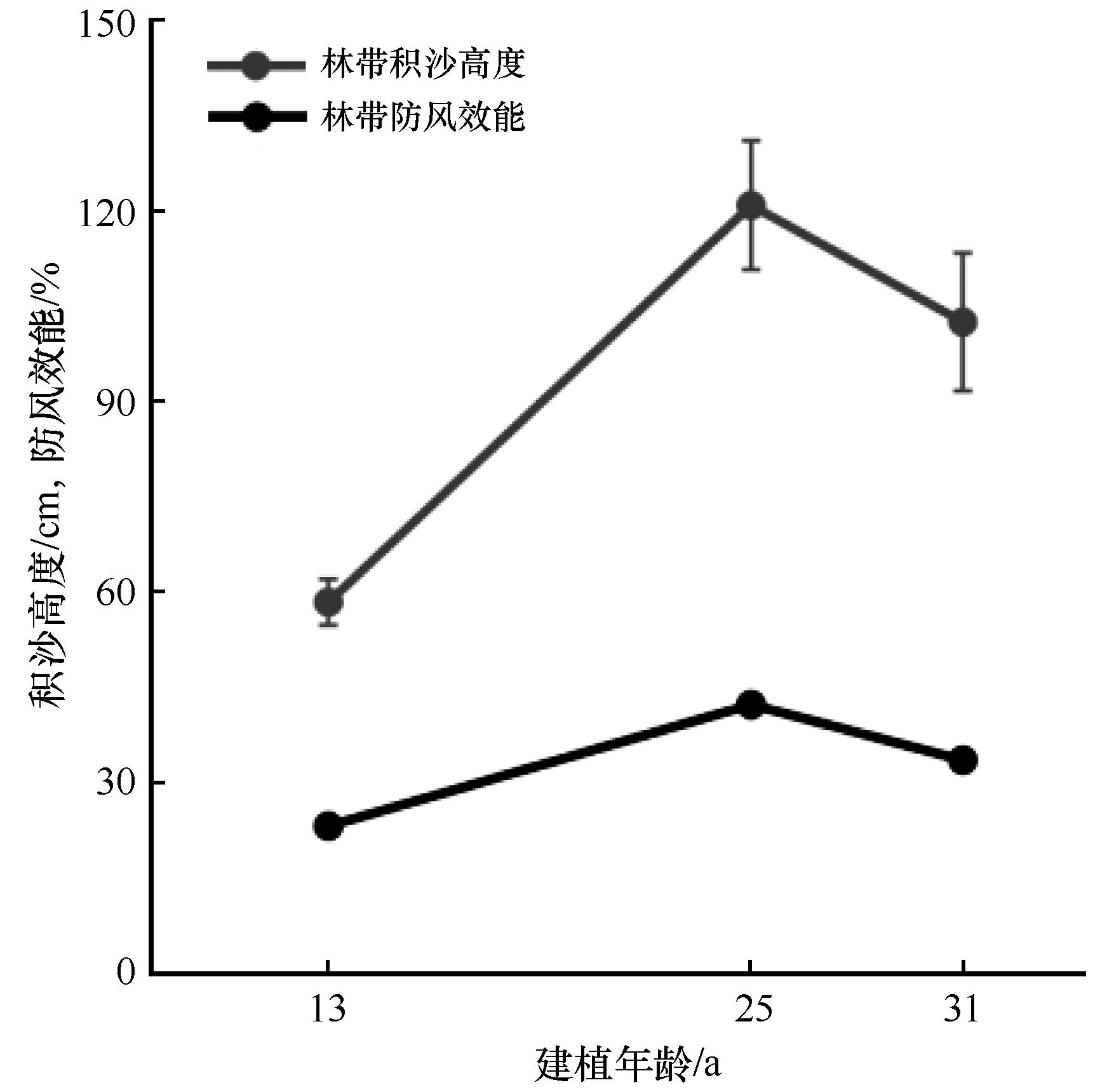 为探究风沙环境下防护林带的结构演变及其对文物保护的长期效益,本文以莫高窟顶典型防护林带为对象,采用“空间代时间”方法,系统调查了建植于1993年(建植31 a)、1999年(建植25 a)、2011年(建植13 a)的林带及对照流沙区(以建植0 a计),评估其群落结构、防护效益与植被特征的时序演变规律。结果表明:(1)随着建植年龄延长,林带结构趋于复杂,灌木多样性增加,草本植物呈先增后减趋势,群落多样性(Shannon-Wiener指数)依次为31 a > 25 a > 13 a > 0 a;(2)林带高度、盖度、多度表现为先升后降,以建植25 a林带最优,疏透度则持续下降,表明其防风能力增强;(3)防护效益呈先强后弱趋势,建植25 a林带在小气候改善、防风能力和抑沙效果方面表现最佳;(4)主成分分析显示林带高度与盖度与防护效益正相关,疏透度与积沙高度负相关,表明林带结构对生态功能的决定作用。研究揭示了防护林演替过程中的关键转折点,应依据建植年龄和结构特征,优化物种配置,适时开展抚育管理,以延缓退化、增强稳定性和持续性。