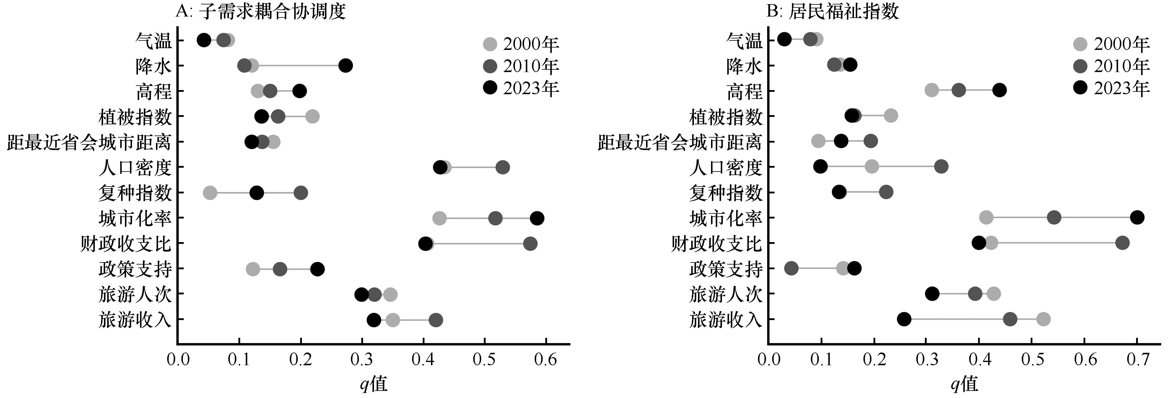 基于人类需求理论构建黄河流域居民福祉指标体系,分析2000—2023年居民福祉时空格局,采用耦合协调度探究居民福祉需求维度的空间关系,通过地理探测器揭示需求维度耦合协调与居民福祉的驱动因素,总结时空格局驱动机理。结果表明:(1)研究期内,黄河流域基本需求增长较缓,空间分布变化稳定,其余维度发展显著提升,大部分地区需求水平在研究期末达到较高状态。各区域福祉指数持续上升且增速存在差异,区域间福祉差异较大。(2)研究期内,黄河流域子需求耦合协调度逐步提升,多数地区从低耦合、较低耦合向较高和高耦合阶段演进,整体达到较高的福祉发展水平。(3)居民福祉时空差异特征是多因素共同作用的结果。主体能动性和政府能动性对居民福祉时空差异解释力较强,为主导影响因子;地理区位和旅游新需求的解释力次之,自然本底的解释力相对较弱。