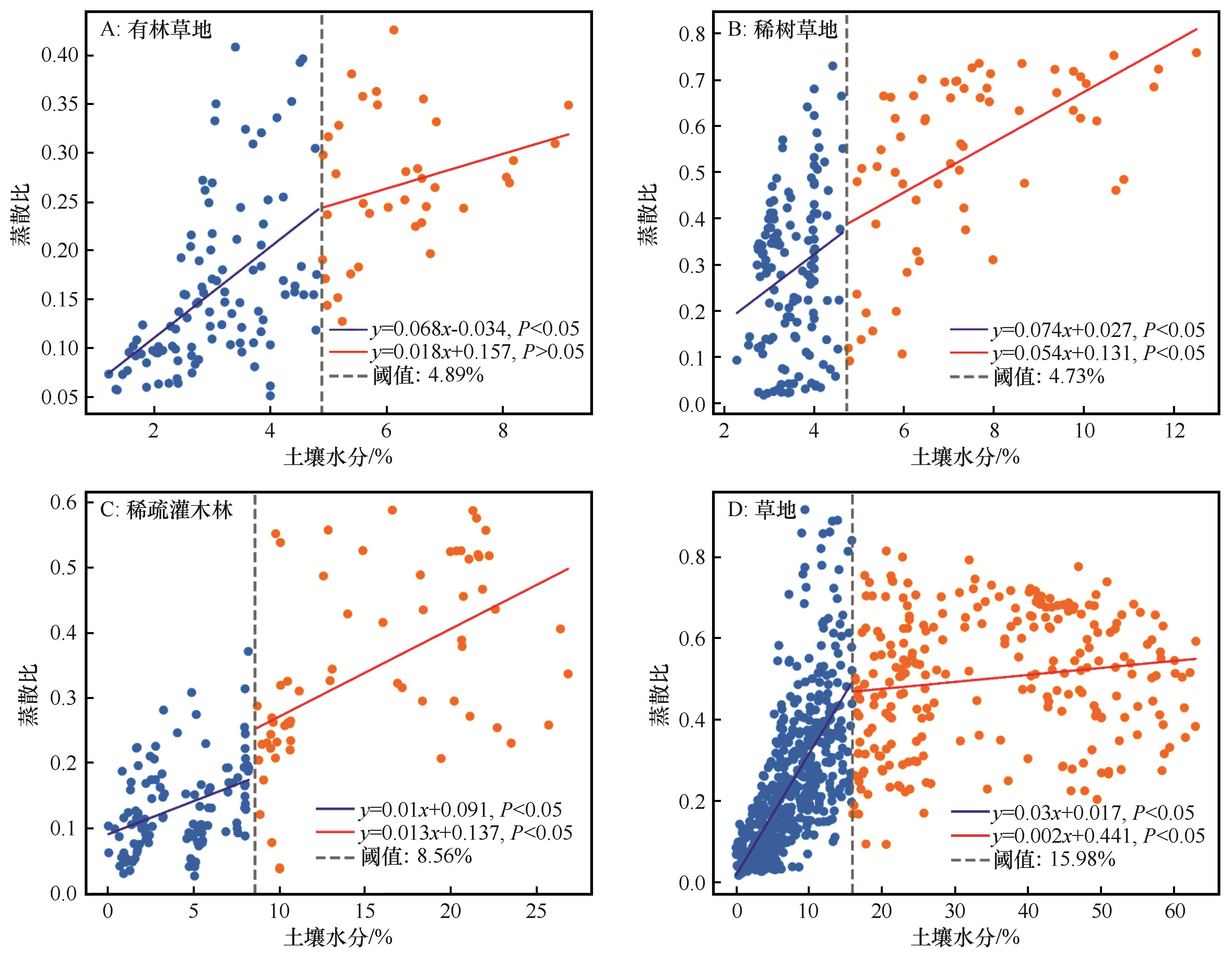 Evaporative fractions and soil moisture thresholds in typical vegetation types of arid and semi-arid regions
