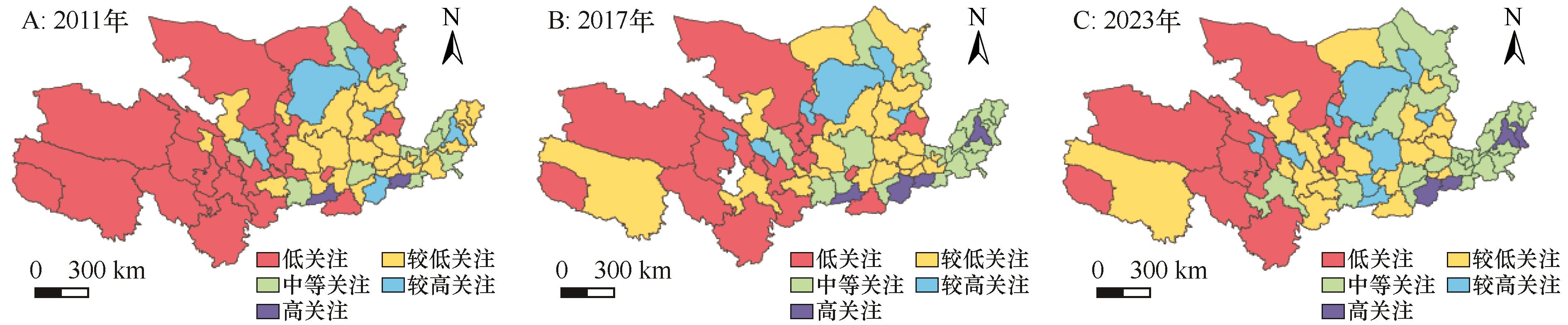 Fig.9 Spatial differentiation of compatibility among tourism resource endowment, tourism economy, and tourism network attention in the Yellow River Basin from 2011 to 2023