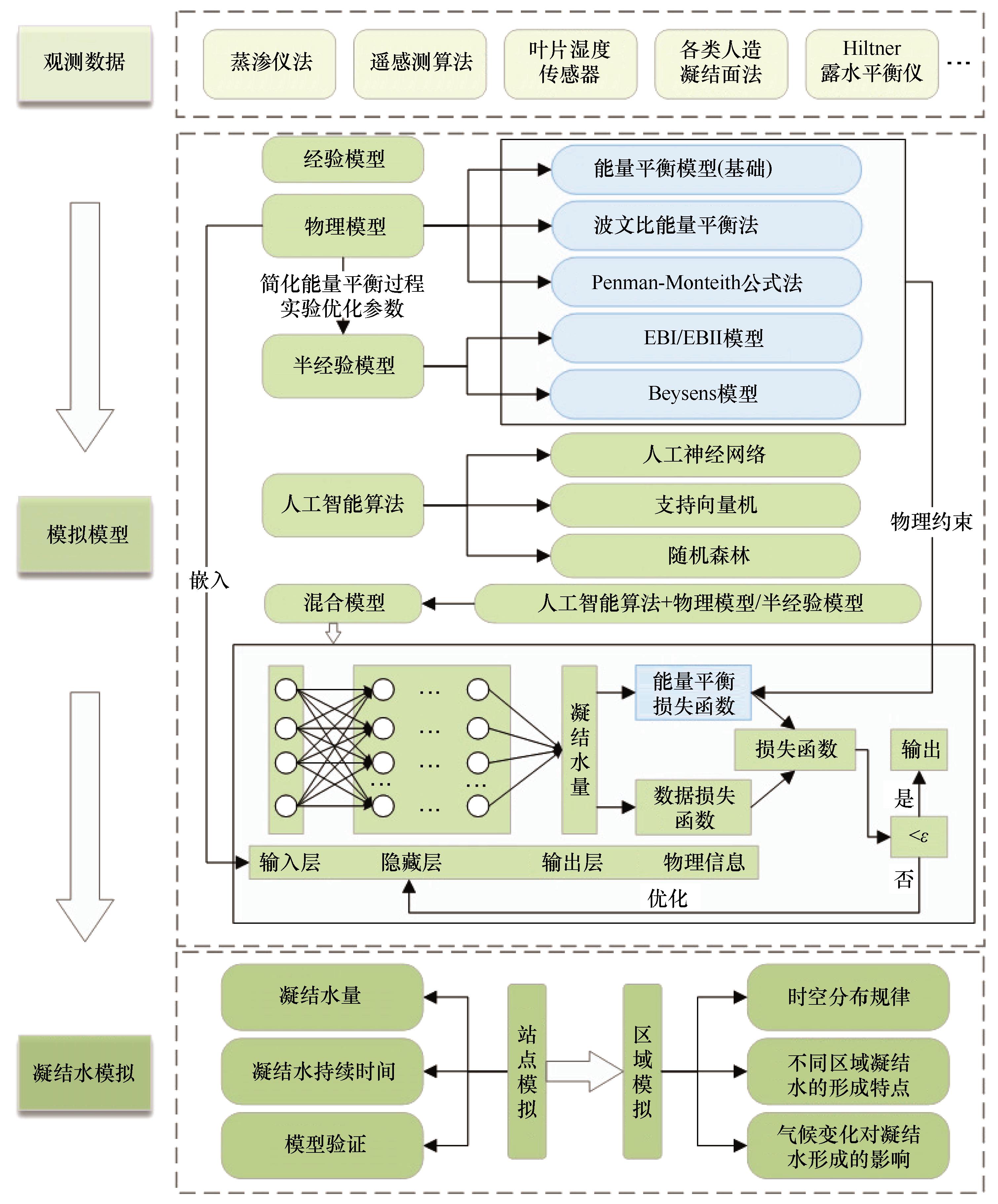 | 物理模型 | 能量平衡模型 | Rn=LE+H(叶片表面) Rn=LE+H+G(土壤表面) Rn=Ri+Rhe+Rcond(人造凝结面) | Rn:净辐射;LE:潜热通量;H:显热通量;G:土壤热通量;Ri:凝结面吸收与释放的长波辐射之差;Rhe:凝结面失去的显热;Rcond:凝结水释放的潜热 | 能反映凝结过程中的能量平衡关系 | 模型构建较复杂,计算需要众多参数,且不易获取 |