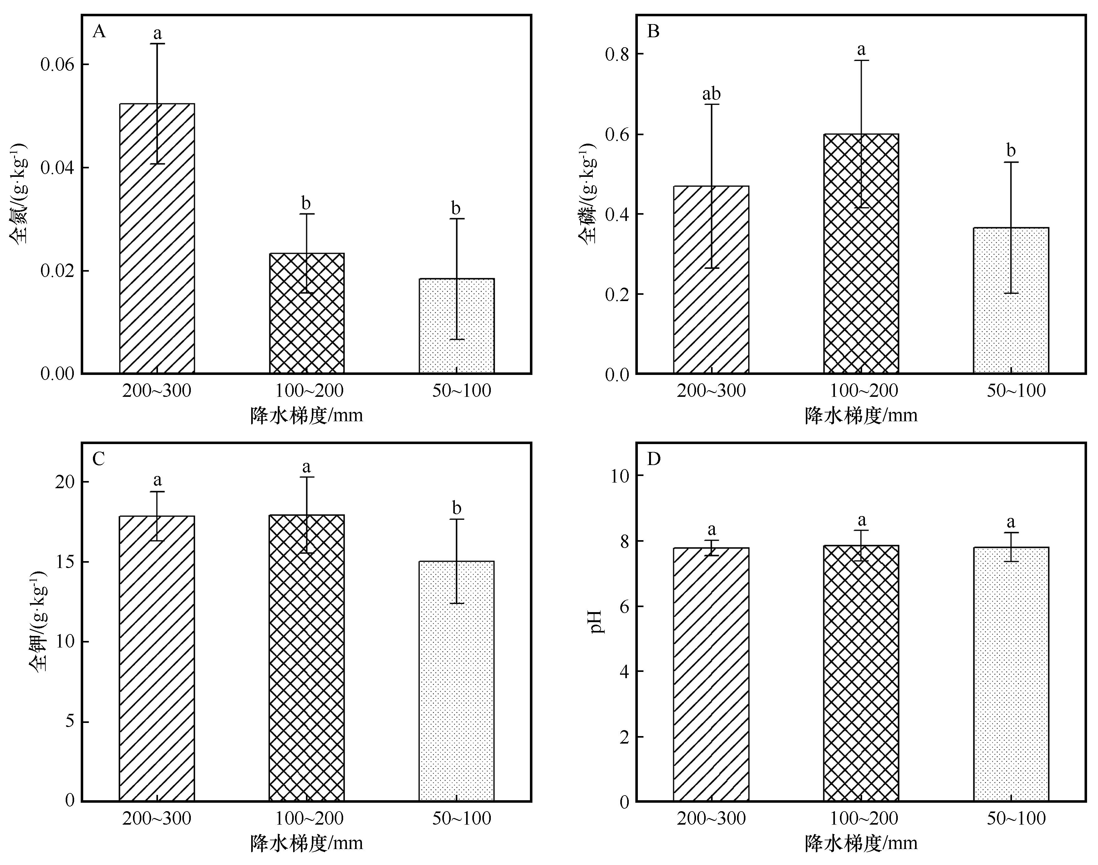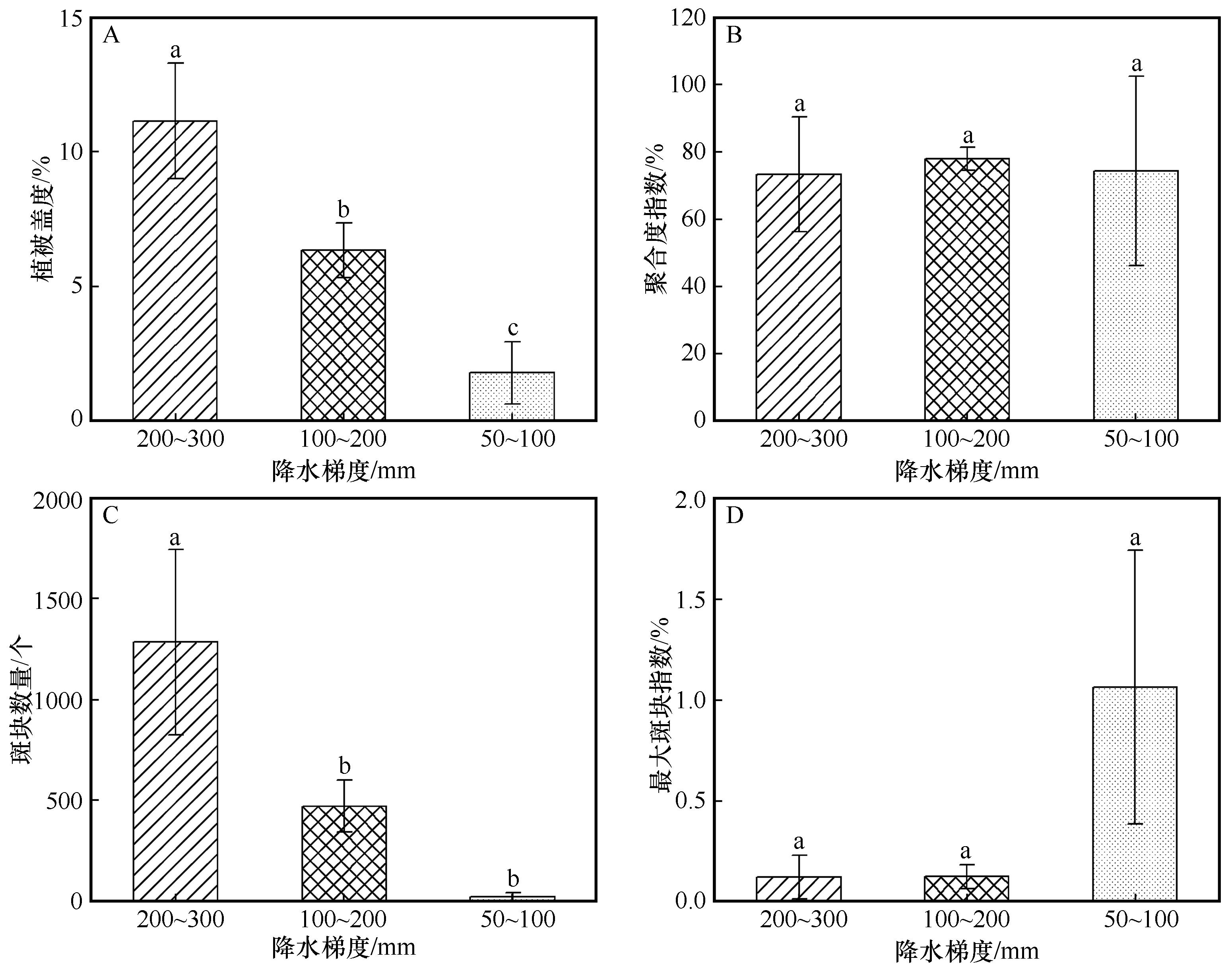 Precipitation is a key factor governing the spatial differentiation of vegetation and plant community dynamics in arid regions. This study was conducted in the Qaidam Basin, where typical desert sites along three mean annual precipitation gradients (200-300 mm, 100-200 mm, and 50-100 mm) were selected to investigate plant community composition, spatial patterns, and soil physicochemical properties, and to explore their relationships with precipitation. Vegetation composition and spatial structure were quantified through field quadrat surveys combined with UAV-based imagery, and their associations with environmental factors were examined using diversity indices, landscape metrics, Mantel tests, and correlation analyses. The results showed that, with decreasing precipitation, the proportion of herbaceous species declined markedly, and plant communities in the 50-100 mm precipitation zone became dominated by a single shrub life form. The Shannon-Wiener diversity index was significantly higher in the 200-300 mm zone (1.14±0.32) than in the 100-200 mm (0.93±0.74) and 50-100 mm (0.36±0.40) zones, whereas Evenness and Margalef richness indices did not differ significantly among precipitation gradients (P>0.05). Vegetation cover decreased significantly with declining precipitation, with mean values of 11.15%, 6.37%, and 1.81% for the three gradients, respectively, accompanied by a shift in spatial pattern from relatively continuous to sparse and fragmented. Soil nutrient levels were generally low and showed no significant differences among precipitation zones. Total nitrogen in the 0-20 cm soil layer was highest in the 200-300 mm zone (0.05 g·kg⁻¹), while total phosphorus and total potassium reached their highest values in the 100-200 mm zone (0.60 and 17.97 g·kg⁻¹, respectively). Soil pH ranged from 7.05 to 8.26 across all sites. Mantel analysis indicated that vegetation metrics were significantly correlated with environmental factors as a whole (P<0.01), with groundwater depth showing the strongest association, whereas overall correlations between soil properties and vegetation indicators were not significant (P>0.05). These results demonstrate that vegetation composition and spatial patterns in the Qaidam Basin deserts are primarily controlled by water availability, while the influence of soil nutrients is relatively weak. The findings provide a scientific basis for vegetation restoration and ecological management in high-altitude arid desert regions.