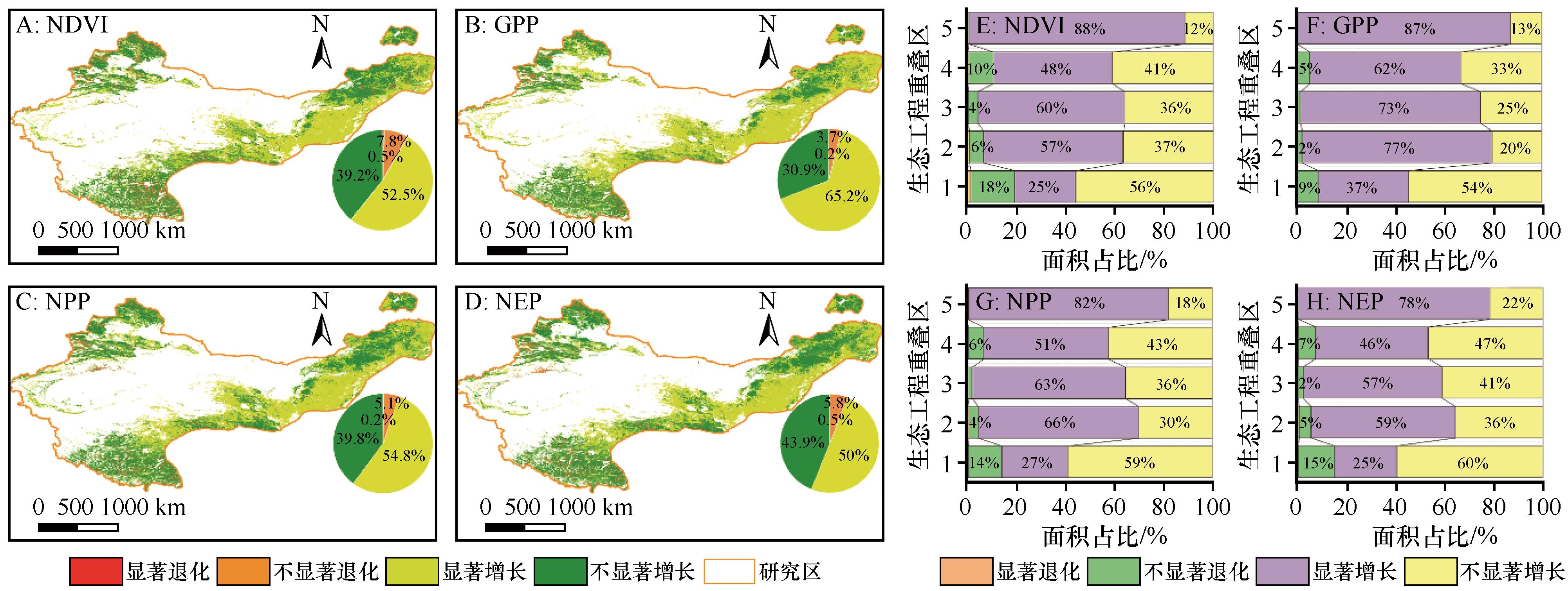 Fig.3 Spatial distribution of vegetation productivity in the study area as a whole (A-D), and spatial distribution of vegetation productivity in ecological project overlapping areas (E-H)