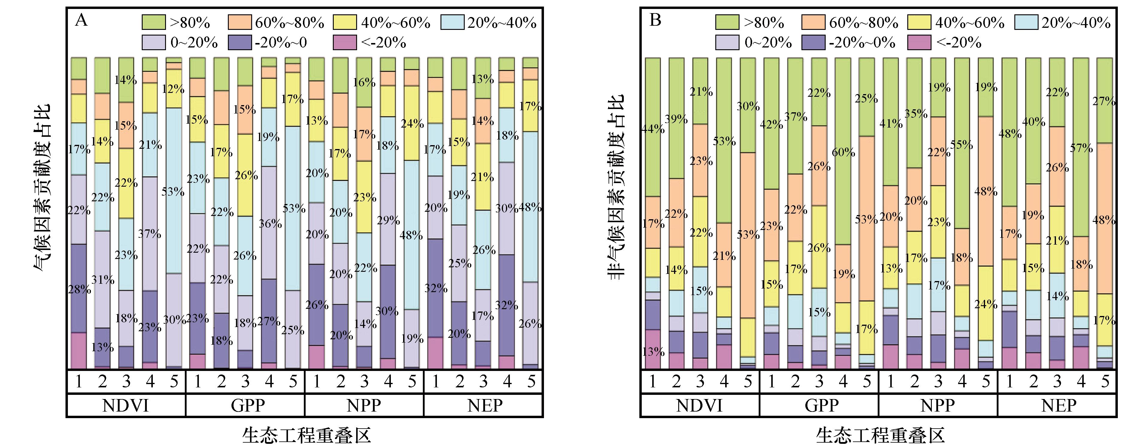 Fig.8 Relative contributions of climatic and non-climatic factors to vegetation productivity changes in ecological project overlapping areas. Numbers 1-5 represent areas with 1-5 overlapping ecological projects