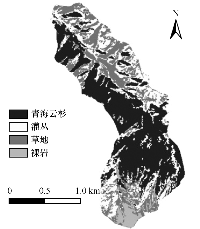 研究区位于祁连山中段甘肃省祁连山森林生态系统定位研究站西水试验区排露沟流域(38°32′—38°33′N、100°17′—100°18′E,海拔2 500~3 800 m,图1),纵坡比降1∶4.2,流域面积2.74 km2。该区属大陆性高寒山地森林草原气候。根据祁连山西水生态站多年气象资料显示,该流域年均气温-0.6~2.0 ℃;年降水量291.3~453.8 mm,集中在5—9月;年蒸发量1 081.7 mm;年日照时数1 895 h;日辐射总量110.28 kW·m-2;年均相对湿度60%[13-15]。流域内海拔不同,水热条件存在较大差异,土壤和植被类型随山地地形和气候差异形成了明显垂直分布带。其中,研究区内建群种青海云杉呈斑块状或条状分布在海拔2 500~3 300 m的阴坡和半阴坡地带,土壤类型主要是山地灰褐土[16]。