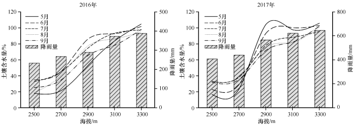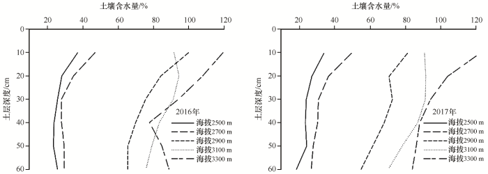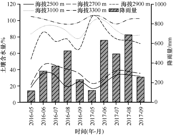总体来看,土壤含水量海拔3 300 m处>3 100 m处>2 900 m处>2 700 m处>2 500 m处,原因除了与降水量有关外,还与高海拔样地地被层盖度高、土壤腐殖质含量高有关,而低海拔样地的土壤较为干瘠,不利于土壤腐殖质层形成。