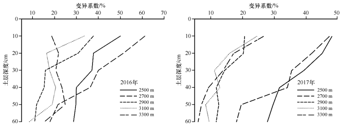 由图5可知,2016—2017年土壤表层0~10 cm土壤含水量的变异系数最高,不同海拔青海云杉林生长季土壤含水量变异系数随土层加深有递减的趋势,说明土壤含水量在垂直空间上表现为土层越深,变化程度越小。海拔2 500、2 700 m处青海云杉林土壤含水量的变异系数高于海拔2 900、3 100、3 300 m处的,这是因为低海拔处青海云杉在该层的非毛管孔隙度较低,土壤蓄水能力较差,土壤水分散失快,所以土壤含水量变化较剧烈。海拔2 900、3 100、3 300 m处青海云杉林土壤含水量在30~40、40~50、50~60 cm土层变异系数变化较小,海拔2 500、2 700 m处青海云杉林土壤含水量在10~20、20~30、30~40 cm土层变异系数变化较小。