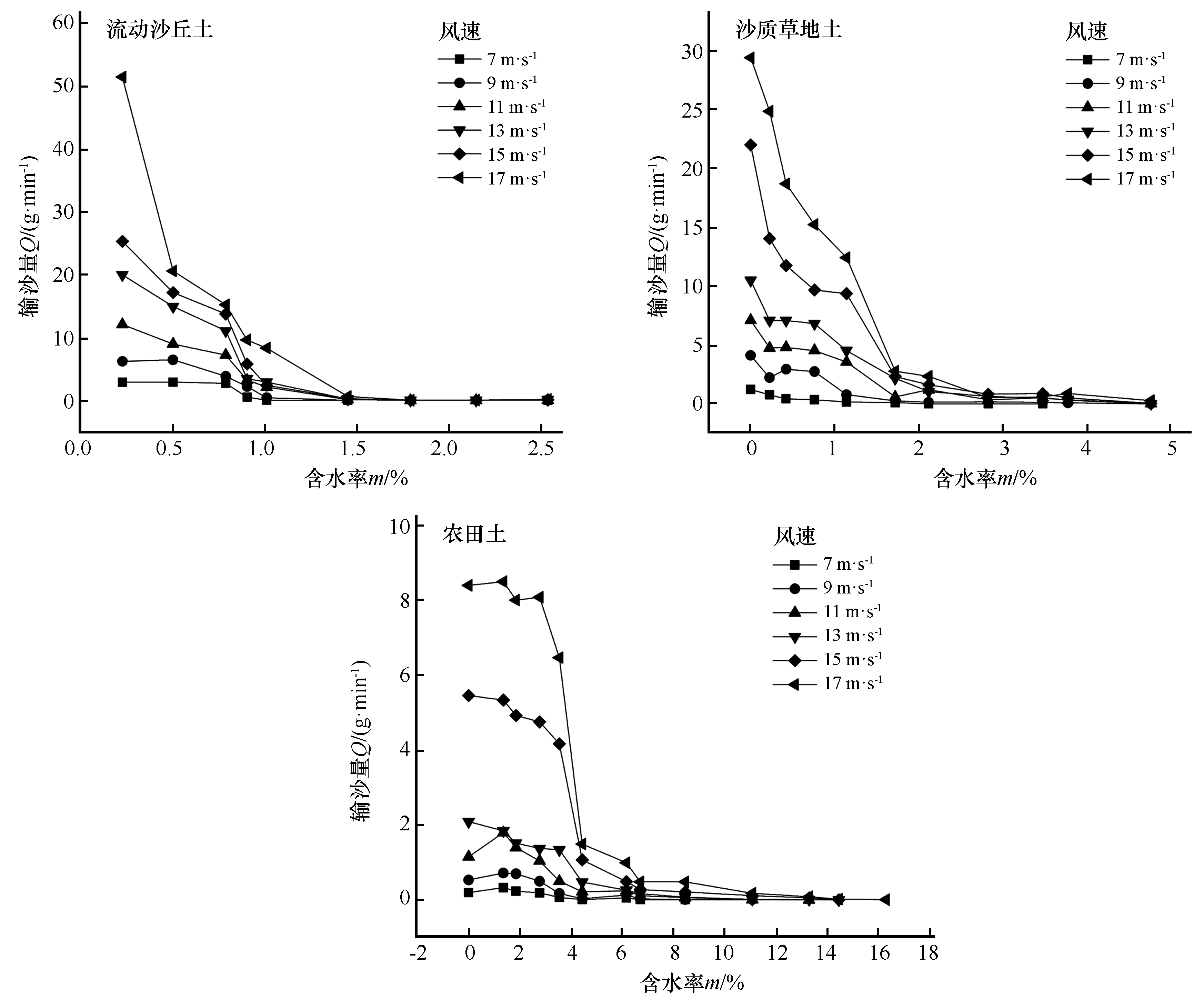 Fig.2 Relationship between water content and sediment transport amount at different wind speeds |