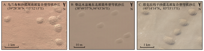 穹状沙丘,也被称为“鲸背”、“蛋糕状沙丘”或“盾形沙丘”[1-3]。沙丘平面呈圆形或椭圆形,斜坡较对称,长和宽大致相等,通常没有外部滑动面或明显的曲弧形落沙坡,地球和火星上均有分布[3-4]。在地球上,穹状沙丘约占沙漠的0.9%,通常出现在沙丘场的上风边缘附近,一般呈零乱不规则的个别分布,如中国柴达木盆地东北部常见有这种单个的穹状沙丘,部分地区也有相连的,但仍保持每个穹体的形态特征[5-6]。有的穹状沙丘上发育有次生沙丘,从而成为复合型穹状沙丘,这类沙丘较为高大,形态也更为稳定,高度为40—60 m,在中国多分布于乌兰布和沙漠的西南部和塔克拉玛干沙漠北部(图1),在阿拉伯半岛的大小内夫得沙漠、阿尔及利亚西部大沙漠的东北部等地也分布有一定面积。火星上穹状沙丘则主要出现在沙丘区边缘或者与新月形和较短的线形沙丘相伴分布,高度一般小于30 m[7]。穹状沙丘形成过程复杂,可形成于强单向风和充足的沙源条件下,也可在低风速、双向风下发育穹状沙丘,与风在两个主导方向之间的振动频率有关,其形态和大小具有不确定性,受风况、沙源、沉积物粒度、地形和植被等多种因素影响[8-10]。在风向单一的条件下,穹状沙丘随着宽度和高度的增大,就会沿着沙粒输移路径分别向线性沙丘和新月形沙丘过渡[11]。