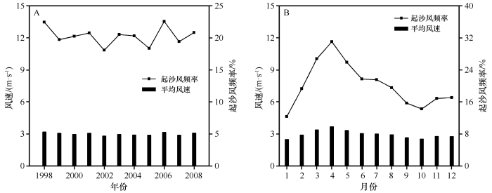 1998—2008年平均风速与起沙风频率的年际变化(A)和月变化(B)