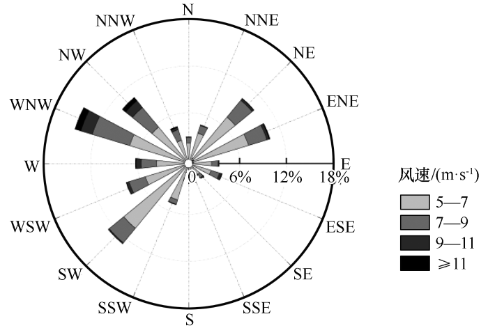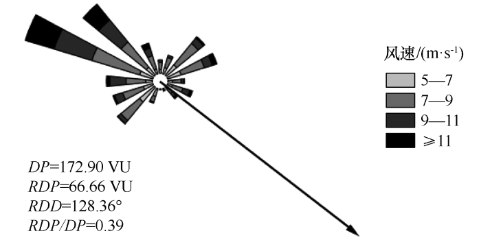 乌兰布和沙漠西南部各年平均风速为2.80—3.17 m·s-1,总体较为稳定,春季为主要风季。起沙风风向均匀多变,主风向为西北风,次风向为西南风和东北风。春季盛行西北风,夏季盛行东北风,秋冬两季则以西南风为主。年输沙势为172.90 VU,RDP/DP为0.39,属于低风能环境,中变率风况。输沙势和合成输沙势的季节特征均表现为春季显著高于其他季节。