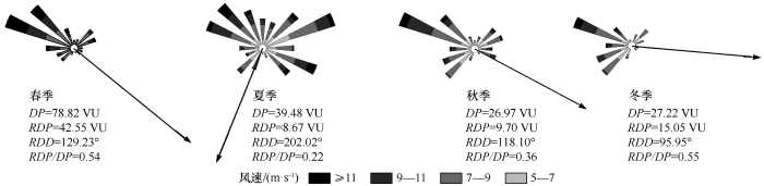 研究区输沙势呈现出季节变化特征(图8)。春季输沙势最大,为78.82 VU,夏季次之,为39.48 VU;秋季和冬季输沙势较为接近,分别为26.97 VU和27.22 VU。合成输沙势则表现为春季最大(42.55 VU),冬季次之(15.05 VU),夏季(8.67 VU)和秋季(9.70 VU)则相差无几。夏季风向变率较高(RDP/DP=0.22),风况类型对应为复杂风况;春季、秋季和冬季则为中等风向变率(RDP/DP=0.54、RDP/DP=0.36、RDP/DP=0.55),风况类型对应为锐双峰或钝双峰风况。季节合成输沙势方向为95.95°—202.02°,夏季最大(202.02°),为SSW方向,冬季最小(95.95°),为E方向;春季(129.23°)略高于秋季(118.10°),分别为SE、ESE方向。偏西风发生频次较高,风力强劲,是造成研究区沙粒朝东南向输移的主要原因。