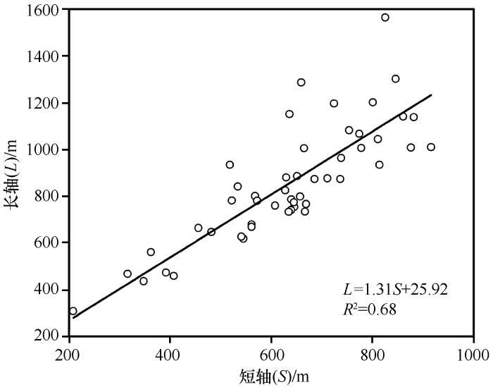 穹状沙丘长短轴之比是描述其形态的重要参数。研究区穹状沙丘长短轴之比为1.10—1.95,平均值为1.31。长短轴之比1.10—1.50的沙丘个数最多,共41个,占比83.67%,其中1.10—1.20的沙丘有13个,占26.53%;1.20—1.30的沙丘共12个,占24.49%;1.30—1.40和1.40—1.50的沙丘个数分别为9个、7个,分别占18.37%、14.29%。长短轴之比1.50—1.95的沙丘共8个,占16.33%。这说明研究区穹状沙丘大多呈椭圆形。给出穹状沙丘长短轴之比的散点图(图10),进行相关性分析可得:穹状沙丘长轴(L)与短轴(S)表现出较强的线性关系(R2=0.68),与前人研究结果一致。通过拟合得到:穹状沙丘长轴(L)与短轴(S)的参数回归方程为L=1.31S+25.92。研究区长短轴之比为1.31∶1。