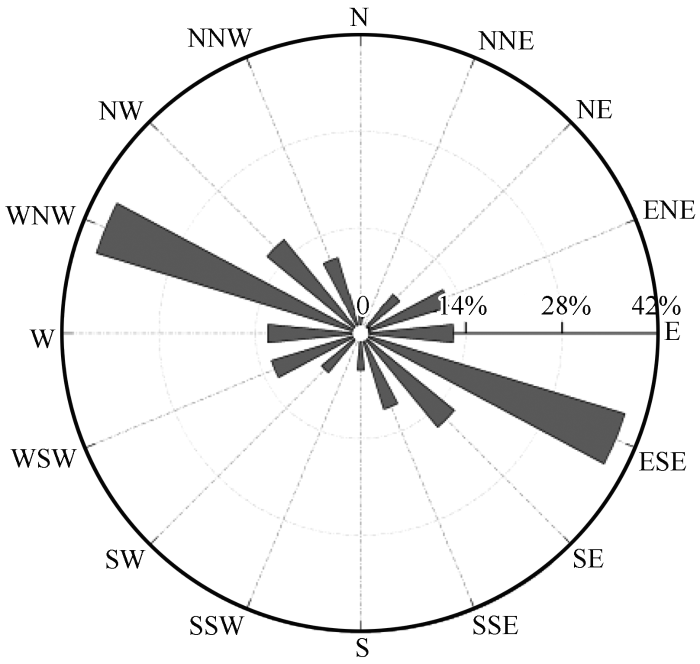 乌兰布和沙漠西南部穹状沙丘呈椭圆形,沙丘平均走向110.66°,与盛行风向大致平行,接近于合成输沙方向,表明盛行风对沙丘走向的显著影响。春季的西北风与夏季的东北风和秋冬两季的西南风3组不同方向且强度相当的风共同作用,使得穹状沙丘沿年合成输沙方向移动,并使得沙丘长轴走向与合成输沙方向近乎平行。通过对风况特征的系统分析表明:乌兰布和沙漠西南部均匀多变的风向是穹状沙丘形成的重要条件,在这种风况条件下,沙丘不易形成滑面,使得沙丘形态长期保持稳定,能够有效阻止沙丘沿着某一风向发生迁移,从而抑制了穹状沙丘向其他沙丘的演化过程。