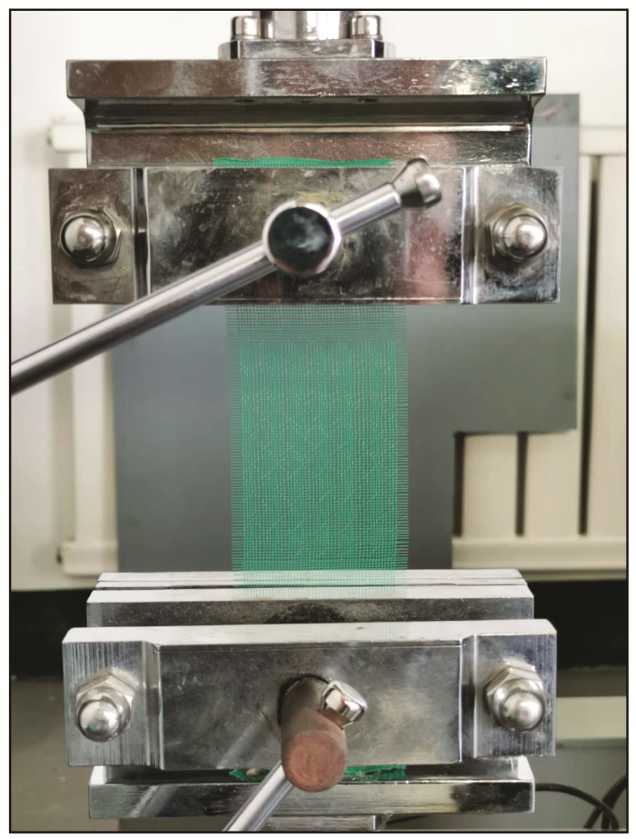 PLA网实验室加速老化试验,每240 h取样1次,PLA网流沙地野外实地铺设试验每0.5年取样1次。力学性能是检验材料老化的重要指标,本文主要以试样的拉伸强度(N)作为评价防沙网是否老化的参数,以GB/T 3923.1《织物断裂强力和断裂伸长率的测定》为试验依据,采用YG(B)026E-250型电子织物强力机,对试样进行拉伸试验(图4 ),试样尺寸50 mm×200 mm,夹距100 mm,拉伸速度100 mm·min-1 。