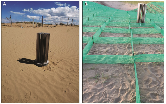 Photos of sand collectors with eight directions installed on the shifting sand dune (A) and inside the sand-protecting barriers (B)