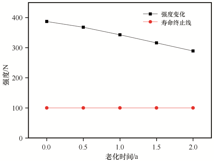 实地铺设2年后,PLA网格沙障的强度由初始的387 N下降到289 N,强度保持率74.68%,强度保持较好(图6 )。塑料材料一般按50%强度作为脆化标志,按这个标准,预计PLA网格沙障沙漠实地铺设3年后出现脆化。而在沙漠地区最高风速可逾30 m·s-1 ,按PLA网孔隙率与风阻设计,当防沙网强度降到100 N时,则可能被大风吹破,因而实际寿命终止。若以100 N为终止强度,则PLA防沙网寿命也可达3年,甚至更长。
