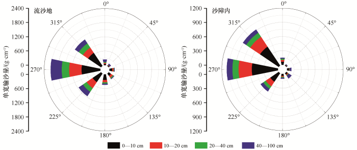 实地观测表明,试验区的输沙方向主要是E、SE以及NE。当输沙方向为E时,在0—10、10—20、20—40、40—100 cm高度,流沙地输沙量分别为805.5、532.5、318.6、465.6 g·cm-1 ,分别占总输沙量的37.96%、25.09%、15.01%、21.94%;PLA网格沙障内输沙量分别为559.7、284.2、131.4、119.6 g·cm-1 ,分别占总输沙量的51.13%、25.96%、12%、10.92%。可以看出,在第一主输沙方向上,流沙地的输沙量63.05%集中在地表20 cm高度内,36.95%分布在地表20—100 cm高度;PLA网格沙障内的输沙量有77.08%集中在地表20 cm高度内,22.92%分布在20—100 cm高度。