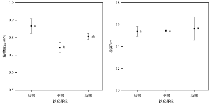 不同小写字母表示草本植物成活率和株高在沙丘不同部位之间差异性显著(P < 0.05)