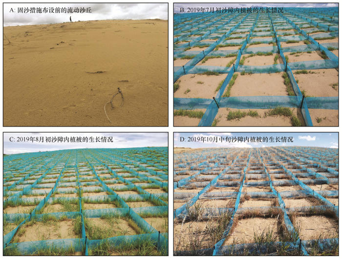 2019年5月中下旬在PLA网格沙障方格内沿沙障边缘条播当地草本植物燕麦和垂穗披碱草。定期观测并记录植物生长情况。