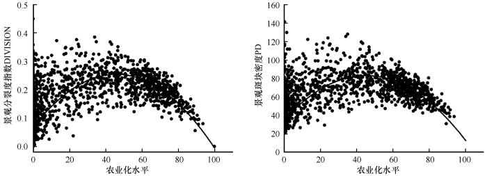 ... 不同景观破碎化指标,如DIVISION、PD与农业化水平之间具有较强的非线性关系(图8 ).这说明景观破碎化程度与农业化水平有较为紧密的联系.DIVISION、PD与农业化水平之间的关系呈现倒“U”型的函数关系,说明农业化的发展并不一直加剧景观破碎化程度,而是当农业化发展到一定的程度后景观破碎度转变为下降趋势.当农业化发展到40%—50%,景观破碎化程度达到峰值.此结果与仇江啸等[28 ] 结论基本一致.总之,在绿洲发展初期,农业化发展水平较低,大量地开垦致使不同类型的斑块数量增加,造成景观破碎化程度持续加剧.而随着农业化发展到一定水平,不同类型斑块之间会出现“粘合”的状态,即不同斑块之间的相互“蚕食”,导致面积扩大到一定的程度后,斑块之间互相整合为一个大的斑块,从而导致景观破碎化程度趋于减小. ...