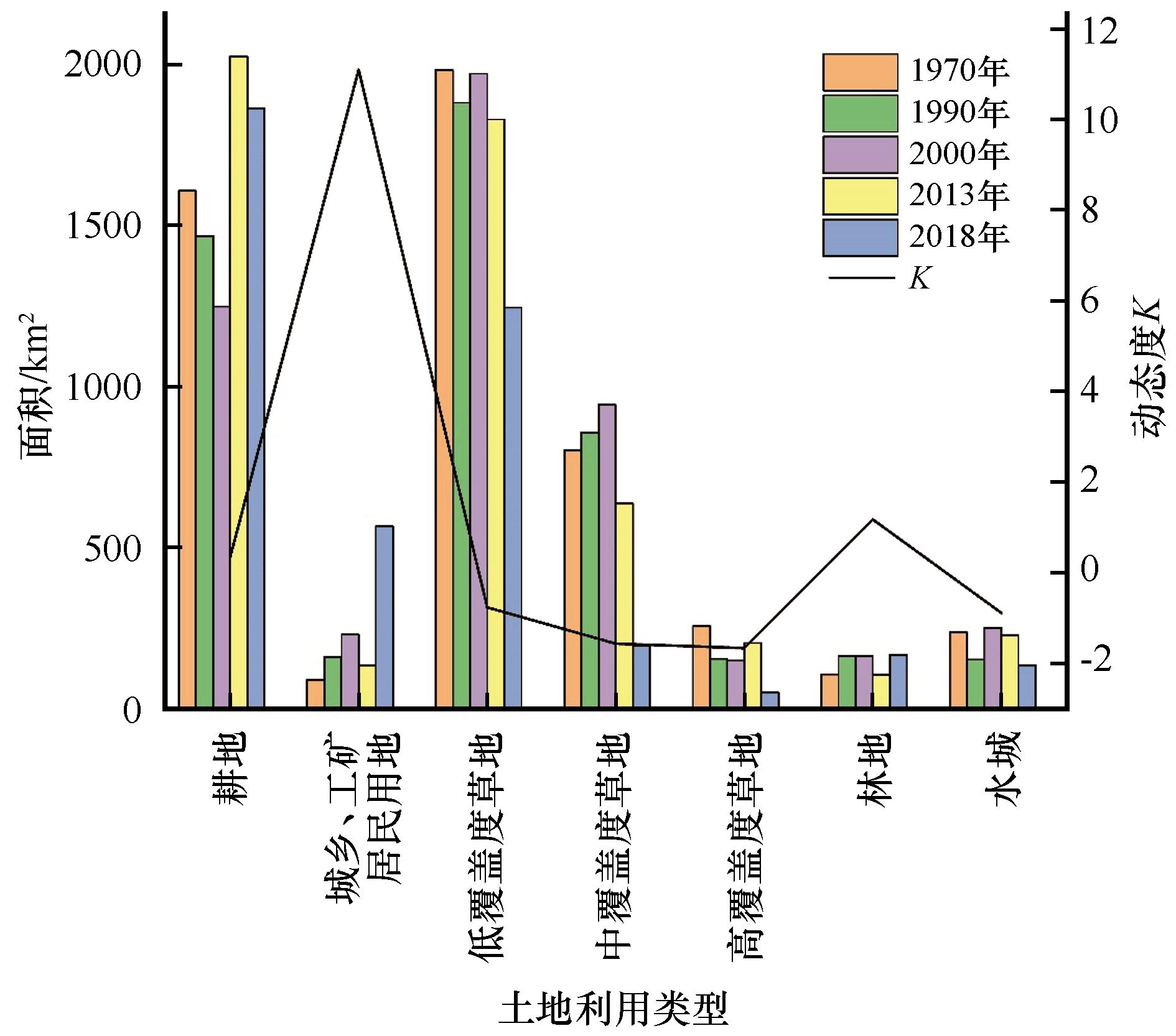 Fig.4 Changes of landscape composition and dynamic degree K of Hotan Oasis |
