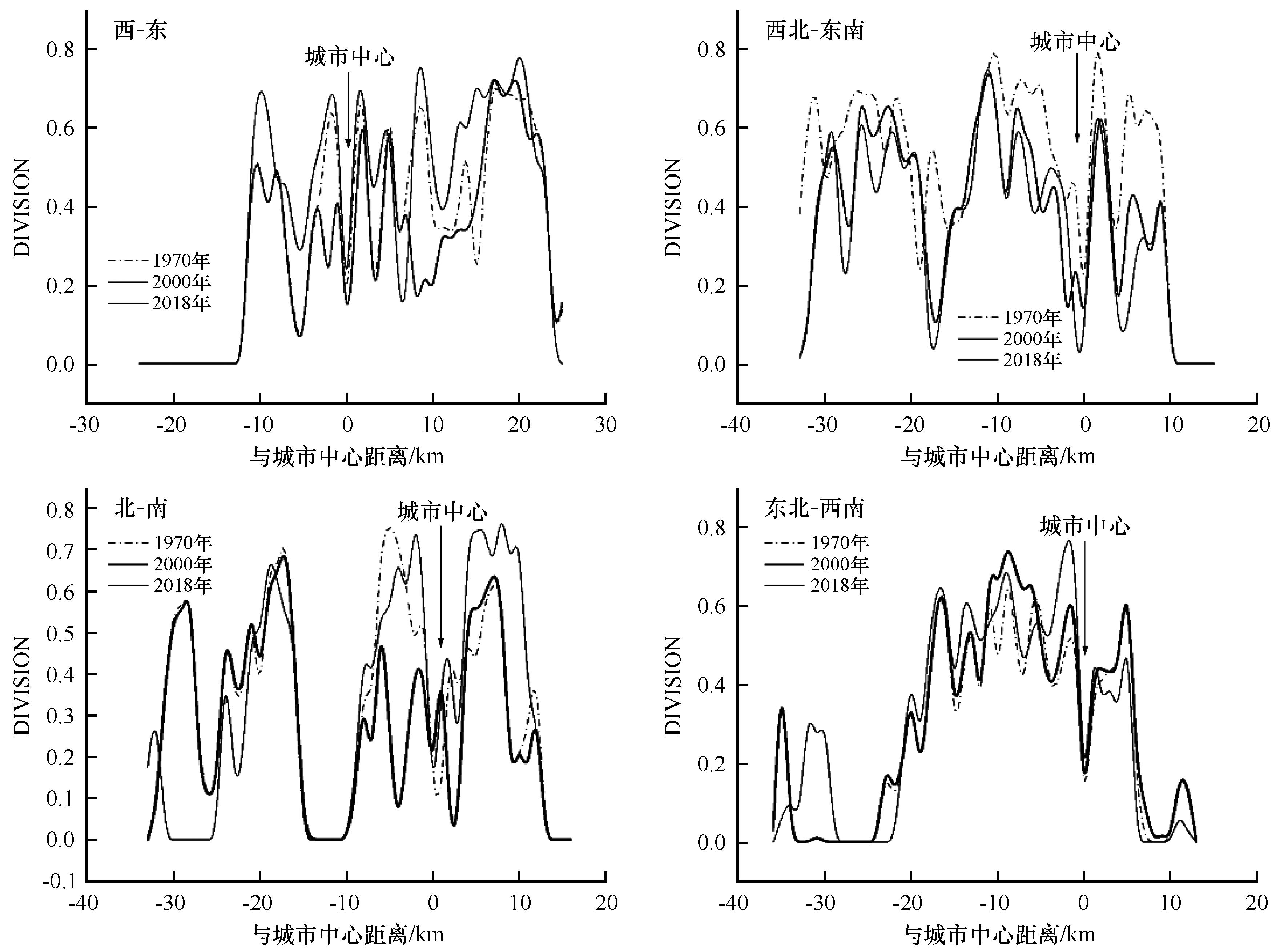 图6 景观分裂度(DIVISION)在城市8个方向上的时间梯度变化规律 |
