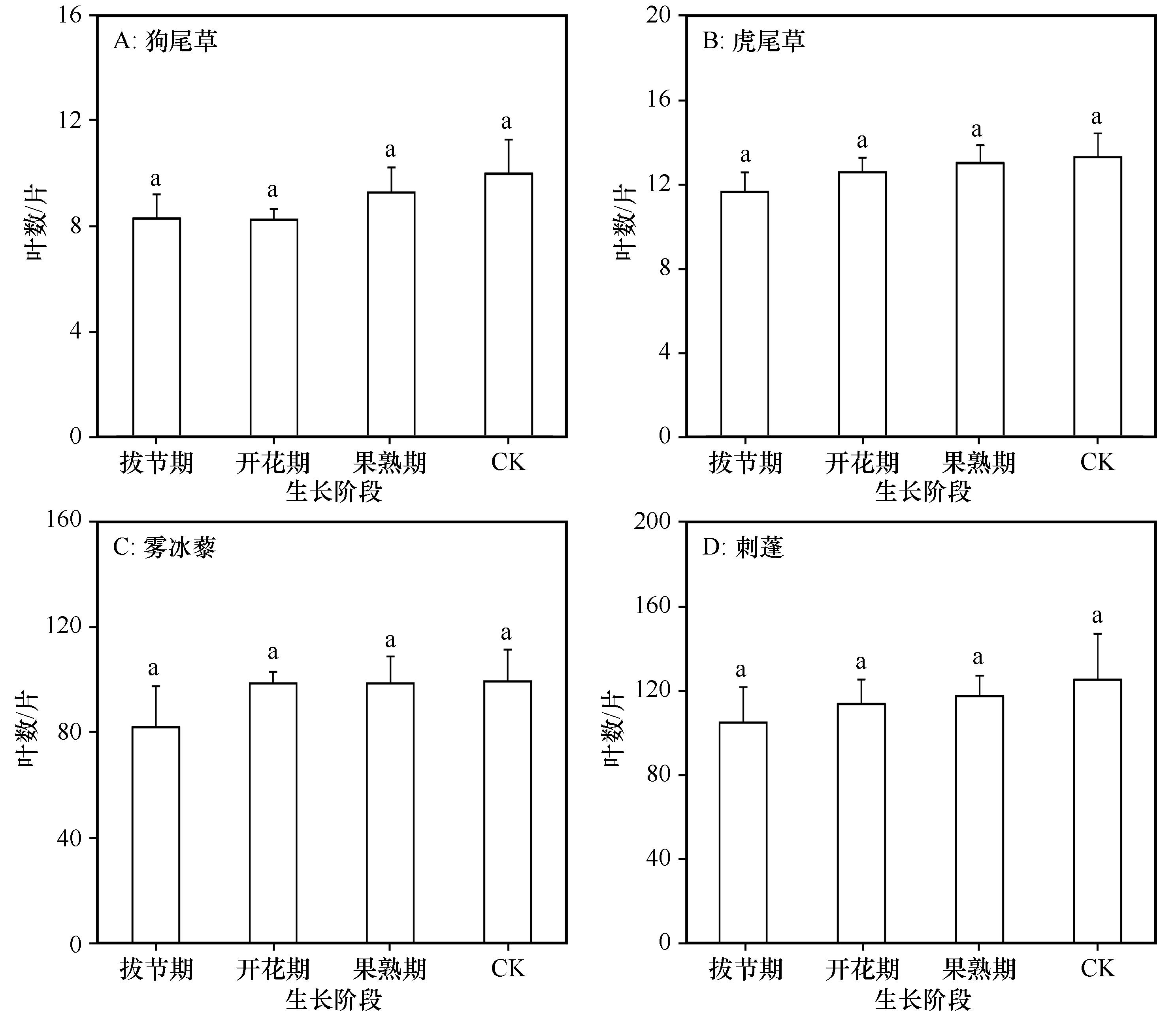 图4 小降雨减少对4种一年生草本植物叶数的影响 |