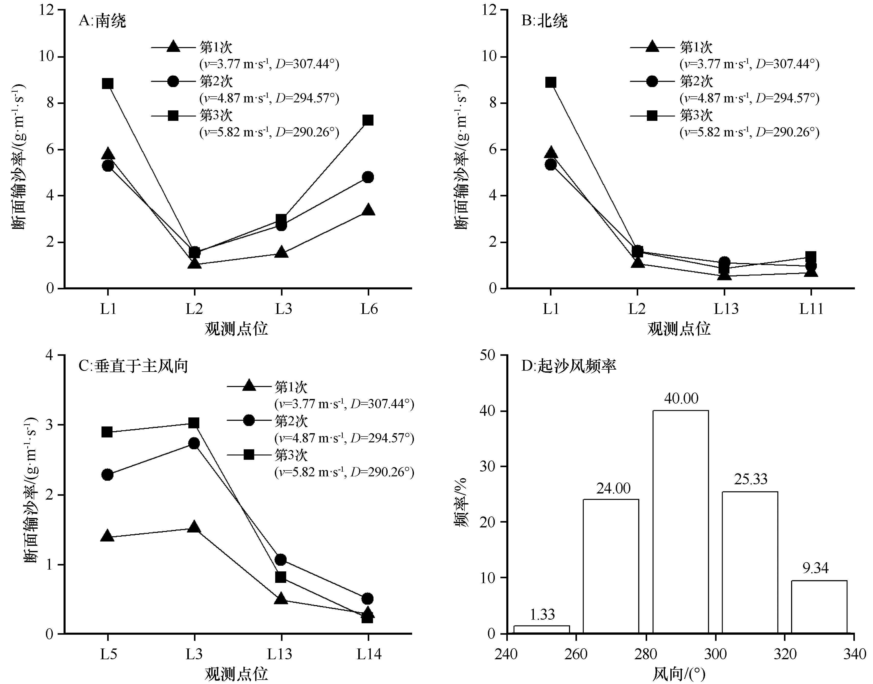 图10 各测点输沙率变化(A—C)及对应观测期间起沙风风向频率(D) |