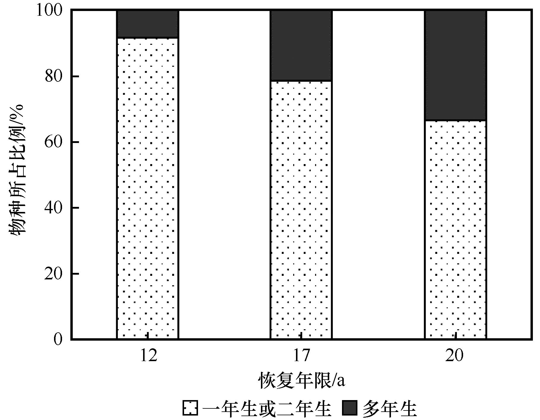 图2 不同恢复年限沙质草地植物不同生活型物种所占群落总物种百分比 |