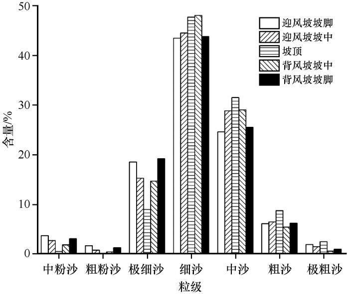 迎风坡坡脚中粉沙、粗粉沙、极粗沙含量高于背风坡坡脚,其余粒径组沙粒含量低于背风坡坡脚,各粒级组沙粒含量相差均不超过1%;迎风坡坡中细沙和中沙含量低于背风坡坡中,其余粒径组沙粒含量均高于背风坡坡中,除细沙相差3.55%外,其余粒级组沙粒含量相差同样不超过1%;坡顶中粉沙、粗粉沙、极细沙含量低于沙丘其余部位,中沙、粗沙、极粗沙含量却高于其余部位,细沙比背风坡坡中低。