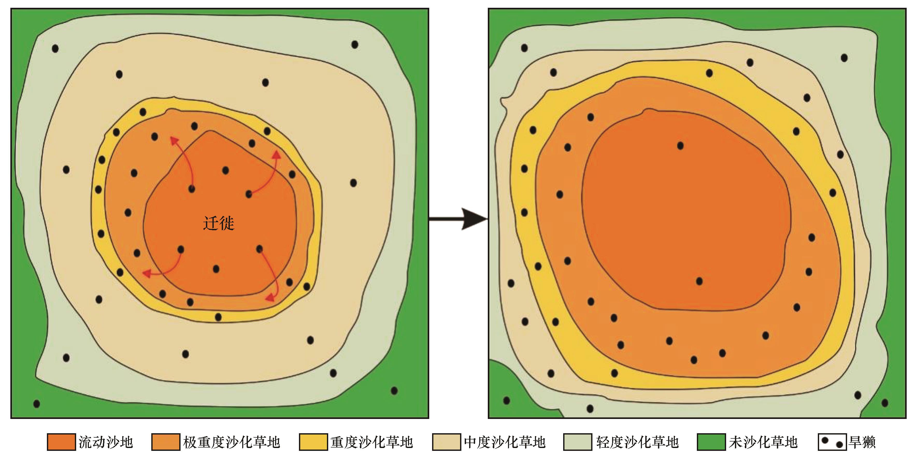 Fig.8 The evolution model of grassland desertification under the influence of marmots |