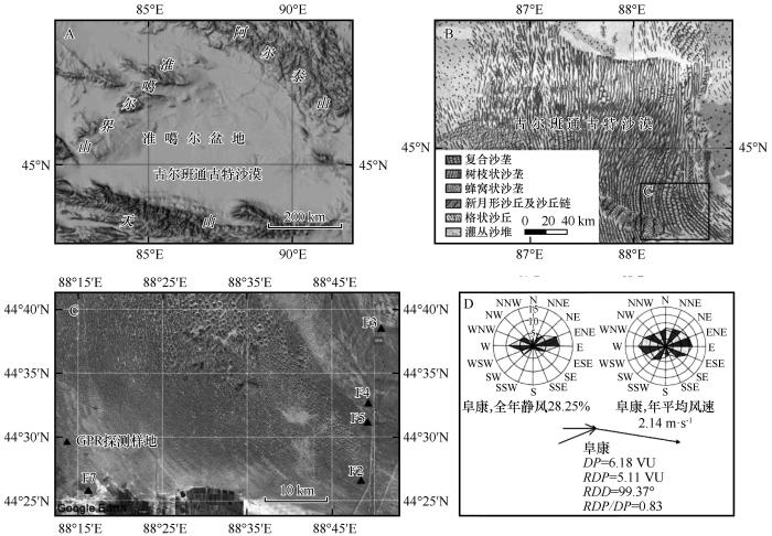 ... 研究区位于古尔班通古特沙漠东南部216国道沿线和阜康东北地区(图1C).216国道北部地区以稳定的偏西风为主,但从准噶尔盆地西部灌入盆地的西北气流受天山北坡大地形反射,在阜康东北部形成稳定的南西西风[30-31].南部代表气象观测站阜康生态站的年平均风频图及年平均风速图显示(图1D),年静风天数较多(平均28.25%),年平均风速比沙漠内部低,说明研究区的风沙活动强度较弱,输沙势玫瑰图显示阜康起沙风方向变率指数(RDP/DP)为中等变率,属于窄单锋的风况环境,总体上看研究区的合成输沙方向(RDD)和沙丘走向是一致的[34]. ...