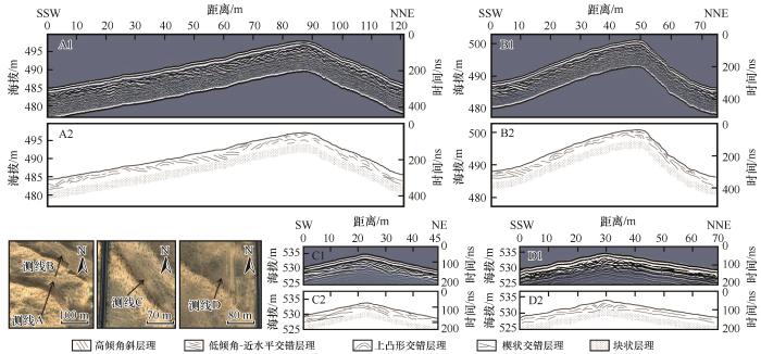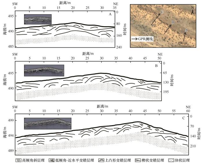 ... 第2种为低倾角-近水平交错层理雷达相,反射面倾角3°—15°或近于水平,伸展长度可达10—15 m,其特征与第1种雷达相相似,但主要分布于线形沙丘面向主风向坡面(南坡)的中下部或分布于两翼坡脚的位置,成因为风力堆积而成(加积层),反映两翼坡脚较弱的风力作用[3,14,39-40]. ...