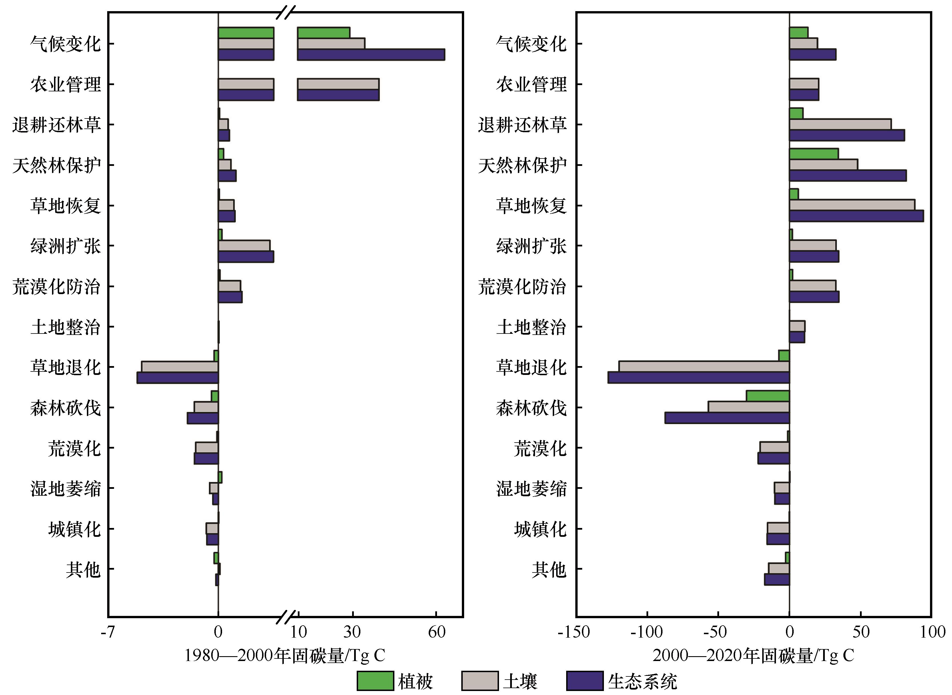 | 图7 1980—2020年各环境因素对陆地生态系统固碳量影响 |