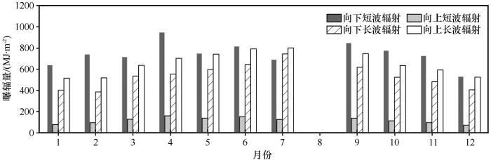 全年向下和向上长波辐射总曝辐量为5 879.5 MJ·m-2 和7 195.2 MJ·m-2 ,二者月均曝辐量为489.5 MJ·m-2 和598.7 MJ·m-2 ,均分别在7月和1月出现最大、最小值,二者最大值对应为743.7 MJ·m-2 和799.4 MJ·m-2 ,最小值则对应为400.5 MJ·m-2 和513.2 MJ·m-2 ,受太阳活动及地球活动影响,二者在季节变化上均为夏季最大,冬季最小,春、秋季介于夏、冬季之间。