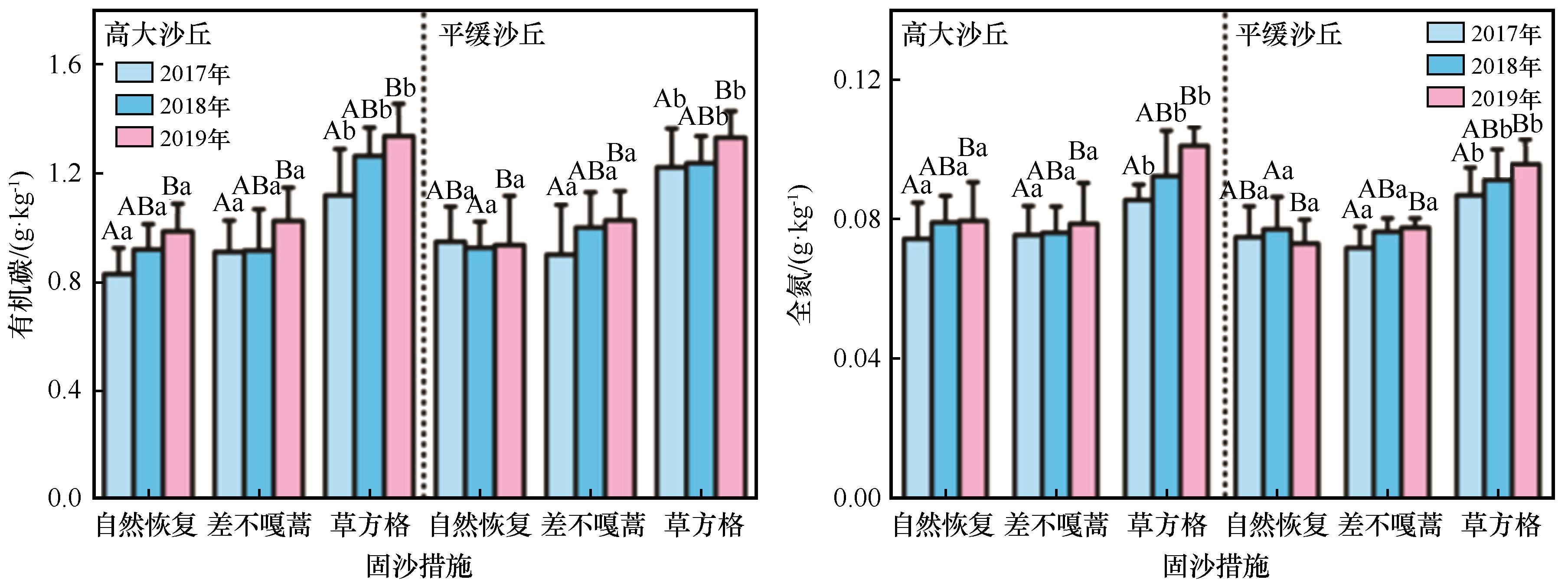 | 图3 固沙措施对沙丘恢复过程中土壤化学性质的影响 |