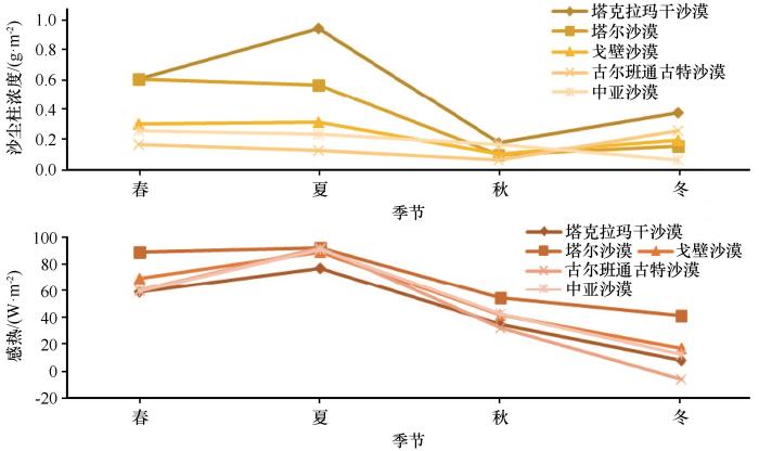各沙漠源区的感热都呈现出春季增加、夏季最大、秋冬季逐渐减小的季节性特征。地表感热是地表风速与地气温差的函数,这两个气象要素与沙尘的局地传输密切相关,所以,沙尘柱浓度也呈现出与感热类似的季节变化。
