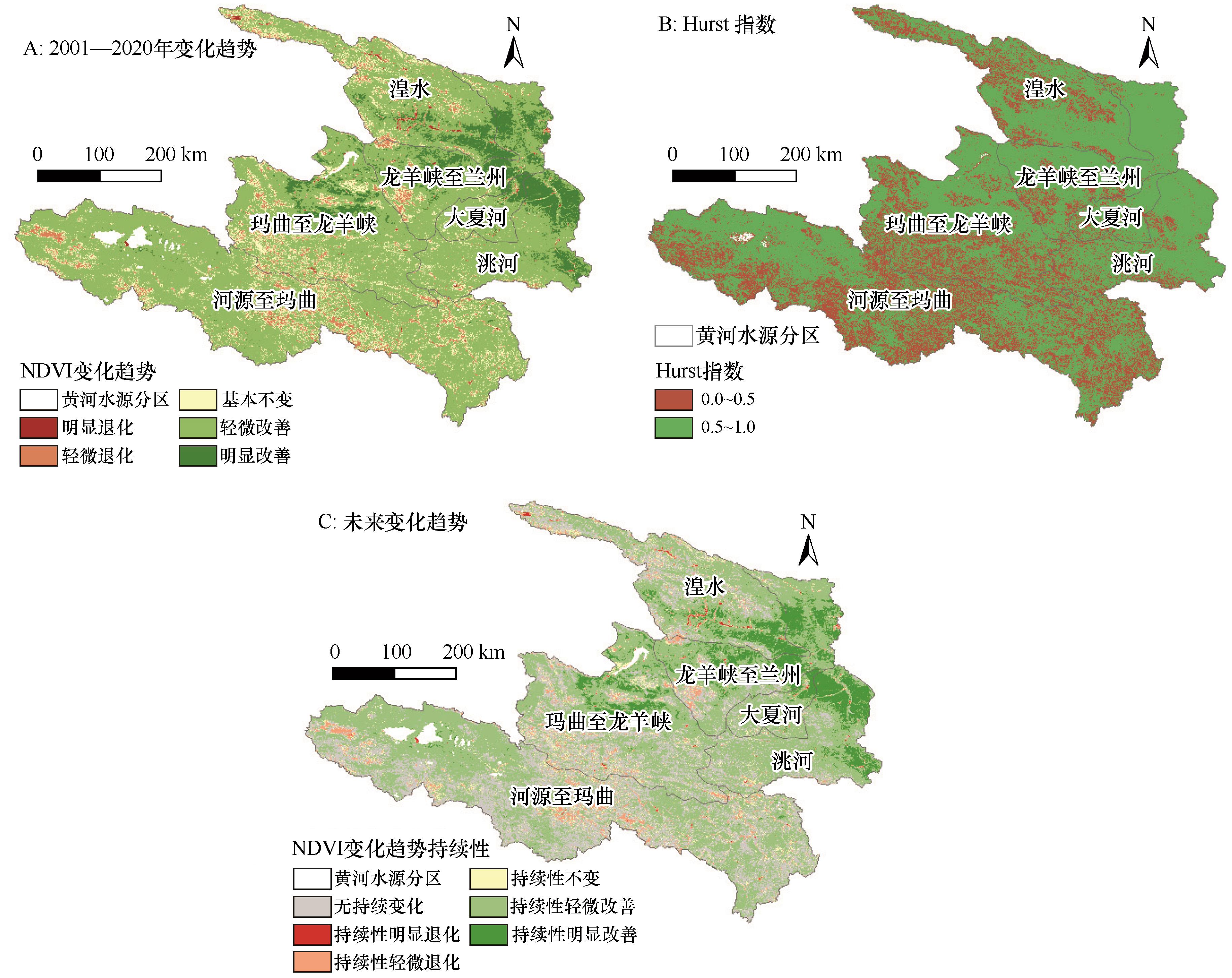 | 图3 NDVI空间变化趋势与 Hurst 指数分布 |