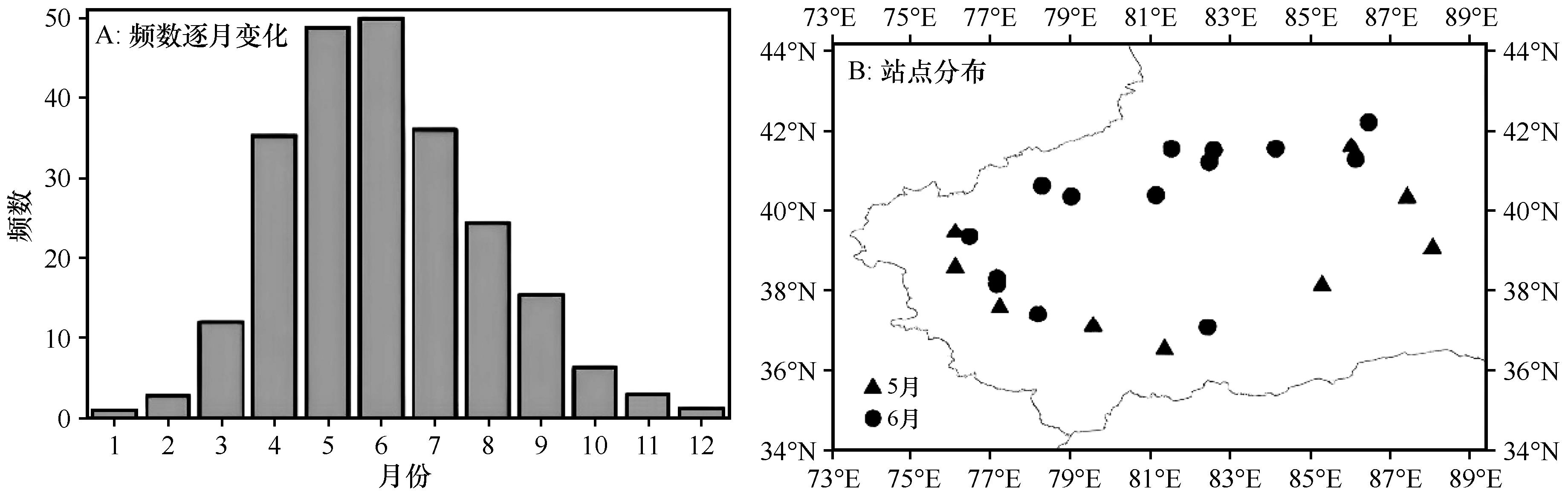 | 图4 1961—2015年塔里木盆地大风频数逐月变化(A)和最大频数出现大风站点分布(B)[ |