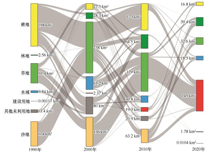 沙地、建设用地及耕地面积的变化量较大(表1 ,图3 )。1990—2000、2000—2010、2010—2020年,沙地面积呈持续下降趋势,总体减少了223.4 km²;建设用地面积则持续增加,总体增加了151.7 km²,增加最明显的时段在2010—2020年;耕地面积呈现波动式下降的趋势,总体减少了89.2 km²。除此之外,林地面积呈现总体增加的态势,总体增加了80.1 km²,草地面积呈现波动式增加的趋势,总体增加了55.2 km²;水域面积略有下降,其他未利用地略有增加。