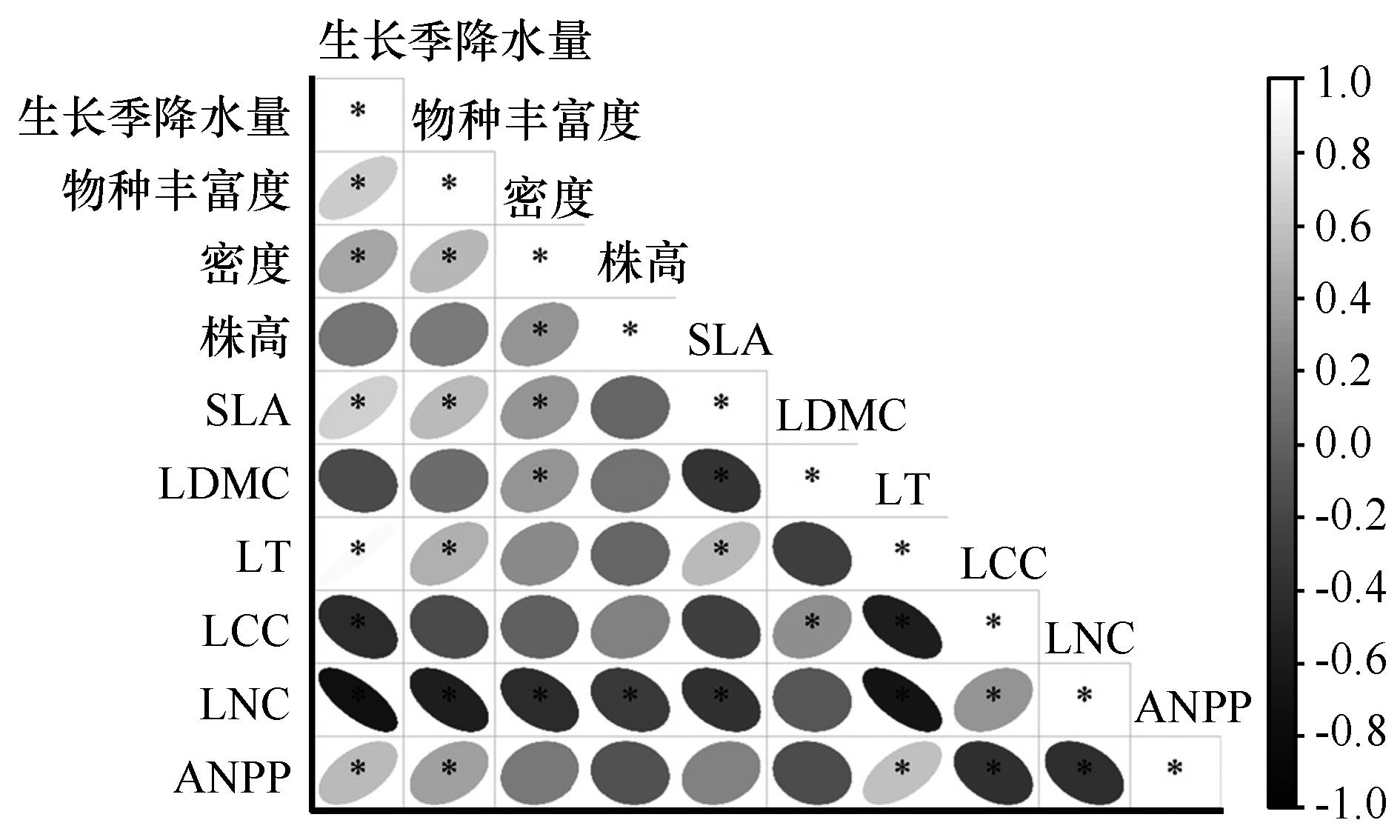 | 图3 退化植被恢复过程中生长季降水量与植物多样性和生产力的相关性分析 |