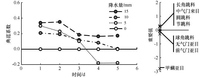 ... 清晨无风时将水(试验区附近的地下水,在储水池中晾晒3 d)喷洒到各处理小区.利用喷灌装置(4 m×4 m的小区均匀排布16个喷头,每个喷头覆盖1 m×1 m的范围,喷头距地面的高度为3 m)将各处理所用水量均匀喷洒到各小区内[13].模拟降雨处理后利用已经埋好的小型陷阱收集器按天(24 h)连续监测5 d土壤动物样品,蜘蛛、螨类和跳虫样品逐日收集.陷阱收集器使用75%的酒精溶液作为保存液,每天收集后将收集器添加保存液放回原处,收集的样品保存在50 mL PET样品瓶中.将收集的动物样品带回室内进行种类鉴定和数量统计,蜘蛛、螨类和跳虫幼体较多,蜘蛛和跳虫样品鉴定到科,螨类样品鉴定到亚目或科[29-31].在动物样品采集的同时用土钻采集每个陷阱收集器附近0~10 cm土壤样品带回室内利用烘干法测定土壤水分含量,利用纽扣式温度记录仪测定10 cm深土壤温度.试验结束后调查每个处理小区草本盖度、物种丰富度,利用环刀测定土壤容重、硬度计测定土壤硬度. ...