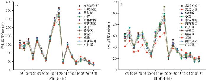 Variation of 5 d average PM2.5 and PM10 concentration at each station in Xi'an in Spring of 2023