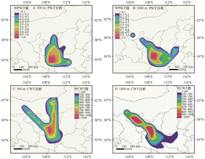 采用PSCF和CWT分析确定西安市潜在沙尘源区,PSCF分析可确定沙尘污染源地的潜在贡献源区[25 ] ,CWT方法可以定量分析不同潜在源区的沙尘贡献度大小。