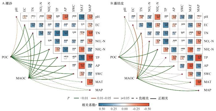 裸沙和藻结皮POC和MAOC与环境因子的相关关系